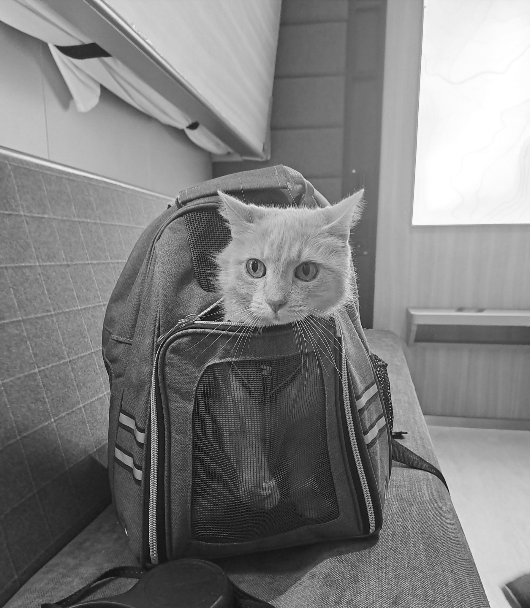 Selvittelin vaihtoehtoja tämän meille kaikille uuden tilanteen ratkaisemiseksi. Joko kissan voi ottaa laivaan kantokopassa täi jättää autoon. Yksin autoon meluisalle autokannelle jättäminen kuulosti heti väärältä.